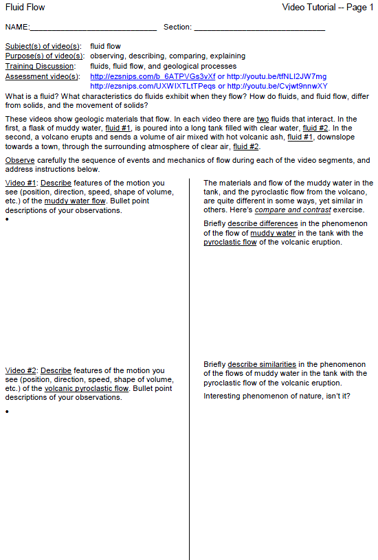 What is a fluid? What characteristics do fluids exhibit when they flow? How does the movement of a volume of fluid differ from the movement of a solid mass? These videos demonstrate fluid flow. Observing and interpreting fluid flow in these videos can help students to better understand some of the larger scale flows that occur on earth and elsewhere. Video tutorial documents may be downloaded for student use.