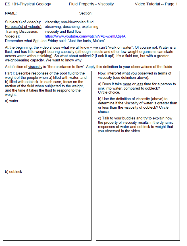 A critical property that controls how a fluid responds to a weight or force on its surface is viscosity. A brief definition of viscosity is the "resistance to flow". Videos may be profitably used to demonstrate fluids of different viscosity, and to stimulate student observation, discussion, and analysis. Here's one example that illustrates the contrast of a pool filled with water with one filled with oobleck.